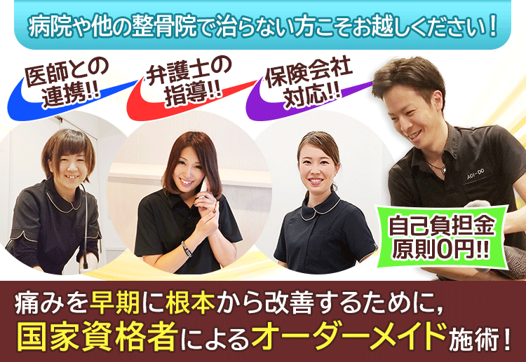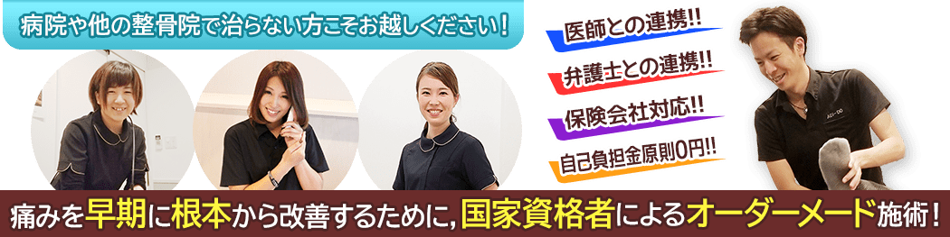 整骨院等で早くから適切な施術を受けていただくことができれば、痛みをより早く改善できる可能性がありますので、ご自身の心身のためにも、お早目に通院を開始されることをおすすめいたします。